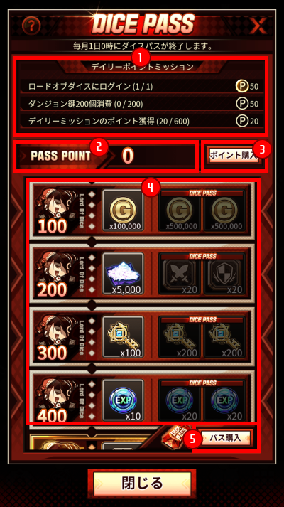 DICE PASS(ダイスパス)は、PASS POINTのポイント数に応じてアイテムを獲得できるコンテンツ。